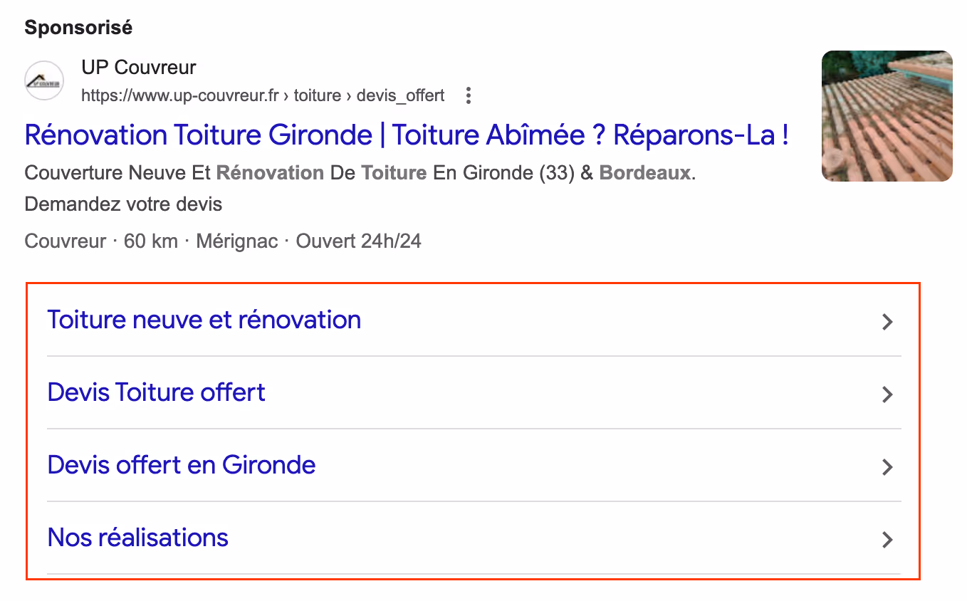 Google les affiche de façon automatique lorsqu’elles sont jugées pertinentes. Elles enrichissent votre annonce principale et facilitent la prise de décision de vos prospects.
